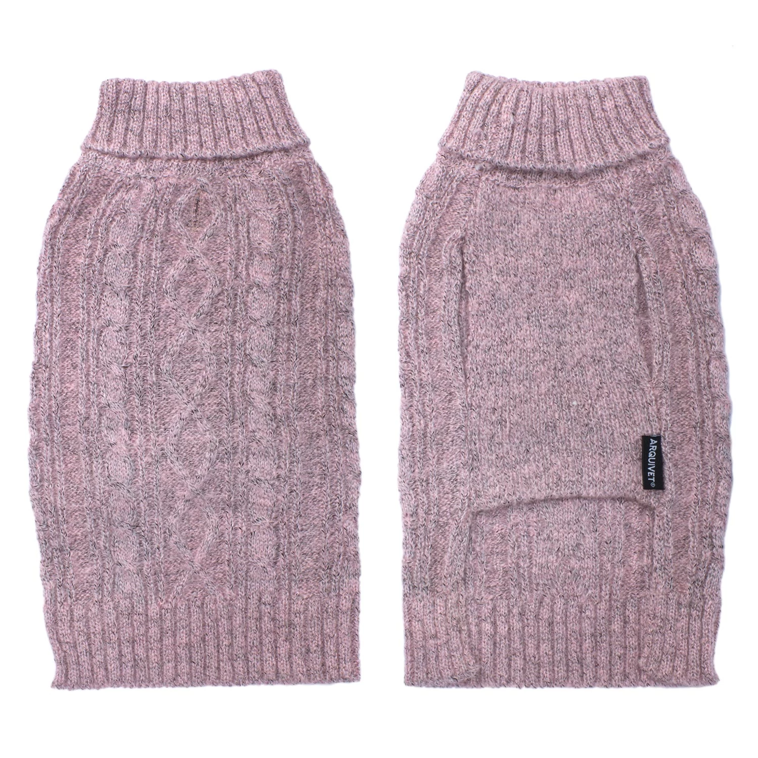 Light pink braided knitted sweater for dogs. With high folded collar. One piece. Openings for front legs. Easy to put on.