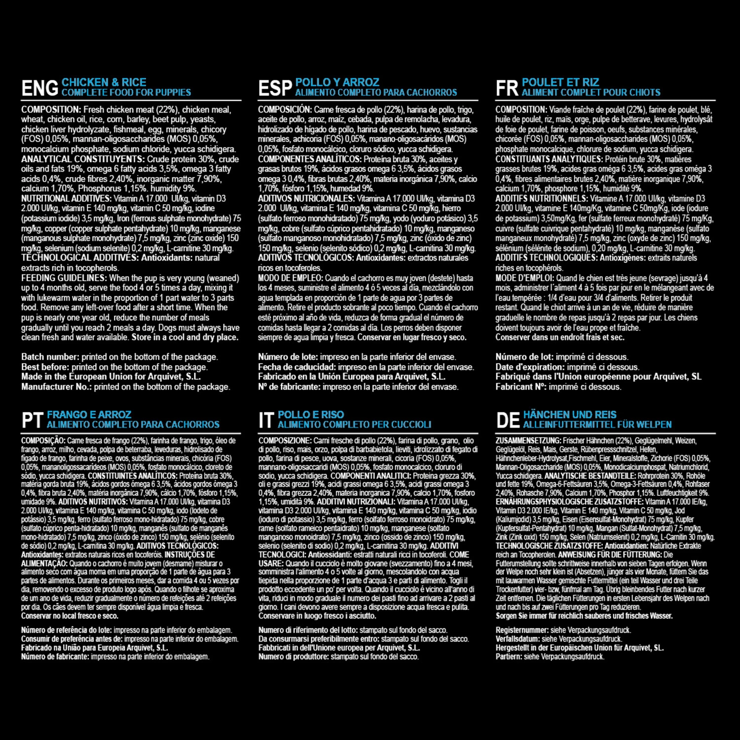 Dog food, based on fresh chicken meat and rice, for puppies and pregnant or lactating mothers. Formulated with high quality ingredients that form the basis for perfect growth.