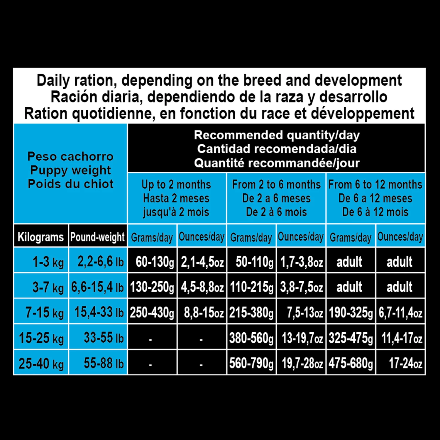 INSTRUCTIONS FOR USE: When the puppy is very young (weaning) up to 4 months old, give the food 4 or 5 times a day, mixing it with warm water in a ratio of 1 part water to 3 parts food. Remove the leftover product after a short time. When the puppy is close to one year of age, gradually reduce the number of meals to 2 meals per day. Dogs should always be provided with clean, fresh water. Store in a cool, dry place.