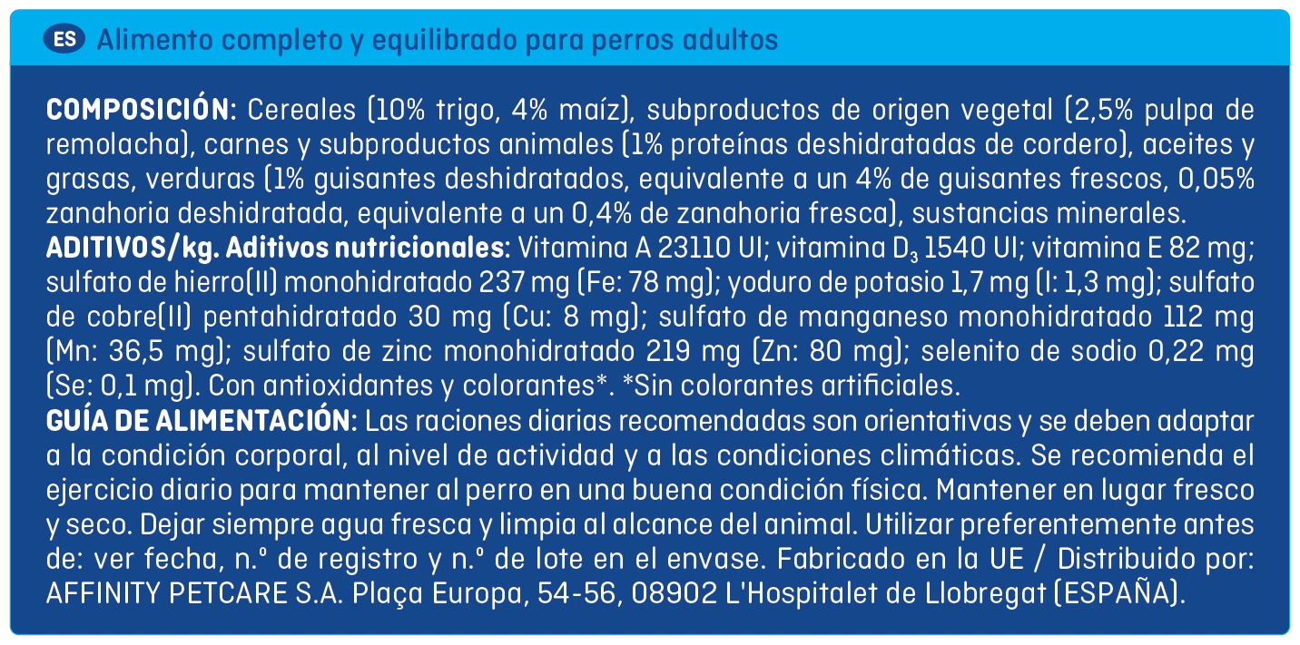 Its croquettes provide the essential proteins for the optimal maintenance of muscles. The rice provides the carbohydrates necessary for good digestion; and the cereals, vitamins and minerals. The nutrients your dog needs to maintain strong bones and healthy teeth.