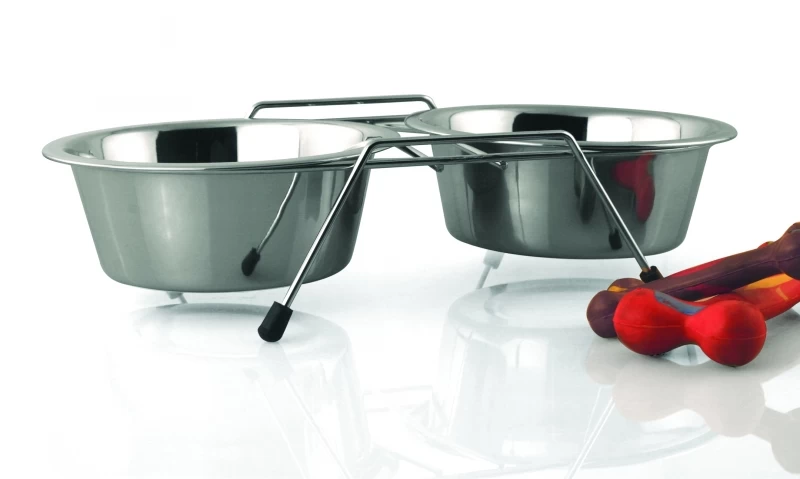 – Stainless steel bowls- With non-slip feet- Dishwasher proofCapacity:XXS – 2 x 240 ml bowls XS – 2 x 470 ml bowls S -2 x 950 ml bowls M – 2 x 1.8 L bowls Ø Diameter:XXS – 11 cm XS – 13 cm S – 16 cm M – 21 cm