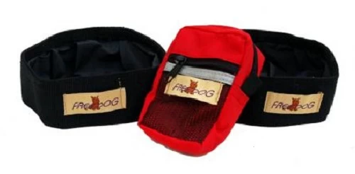 Set of food and drinker for dogs, ideal for trips and walks. Elaborated in a resistant material.