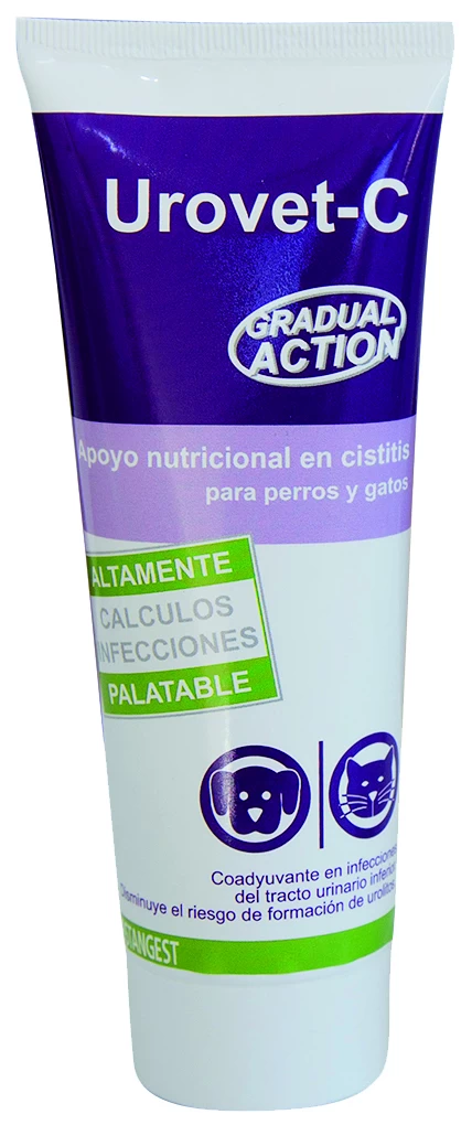 Specific complementary food in paste, for renal diseases in dogs and cats. Indicated for lower urinary tract infections, ideopathic cystitis and bladder stones. Its ingredients regenerate and maintain the protective glycosaminoglycan mucous layer of the urinary bladder. Prevents and controls recurrent, chronic and antibiotic-resistant urinary tract infections. It blocks the adhesion of pathogenic bacteria to the inner wall of the urinary bladder and prevents their accumulation. It is diuretic and antilithiasic.