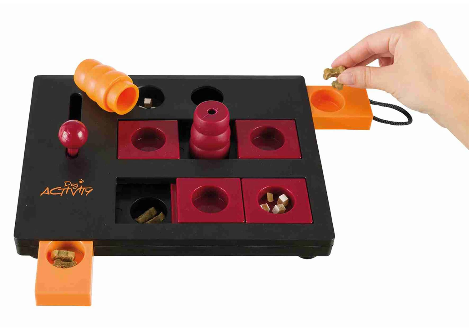 – Expert game: the dog has to move the cones and sliding pieces in order to get the treats.