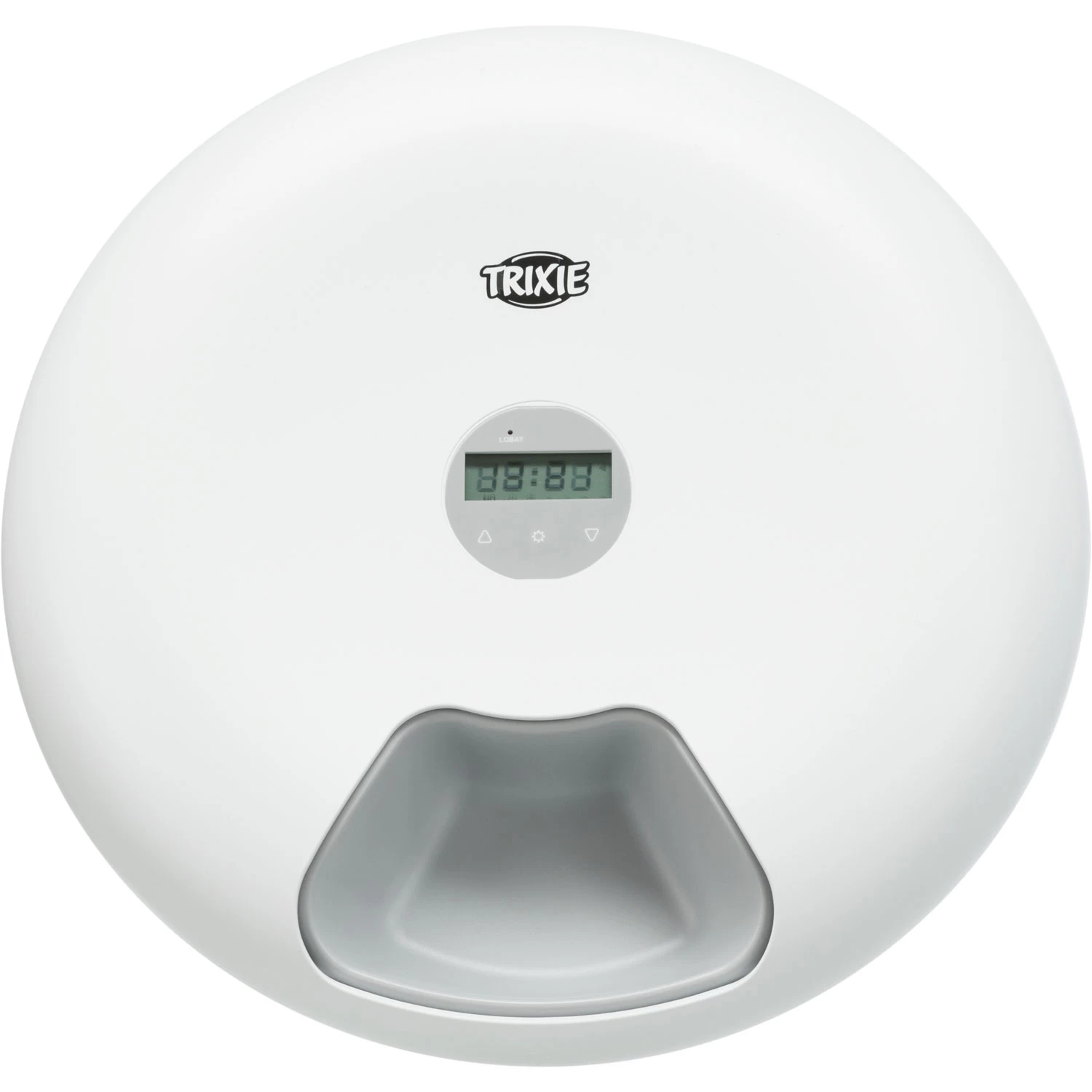 The trixie TX5+1 Automatic Feeder is a smart device that allows you to schedule up to six meals a day for your pet. Each compartment has a 240ml capacity and can be filled with dry or wet food. The feeder has an LCD display that shows the current time and number of scheduled meals. It also has a manual button to serve an extra meal at any time. The feeder is battery operated and has a low battery indicator – a practical solution… and very convenient!