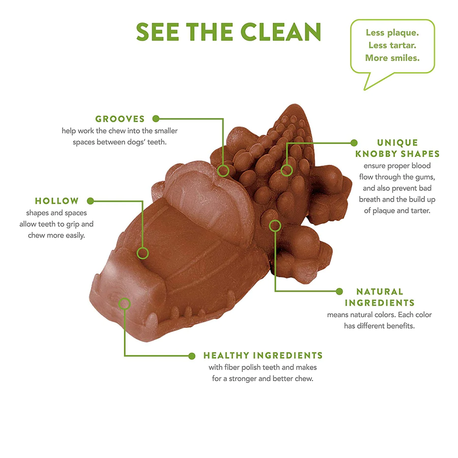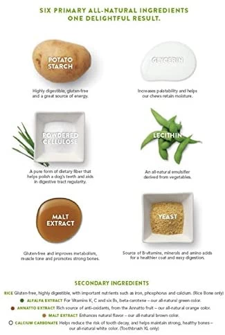 WHIMZEES dental snacks bring together 2 important elements for your dogs health and happiness – dental cleaning and chewing pleasure. WHIMZEES unique designs and plant-based texture ensure proper blood flow between the gums and also prevent bad breath and the build-up of plaque and tartar. All WHIMZEES dental snacks are made with 6 main natural ingredients, which ensure a delicious result: – Potato starch: Highly digestible, gluten-free and a great source of energy. – Glycerine: Enhances flavour and helps our chewy forms retain moisture. – Powdered Cellulose: A pure form of dietary fibre that helps polish your dogs teeth and supports a regular digestive tract. – Lecithin: An all-natural, vegetable-derived emulsifier. – Malt extract: Gluten-free, improves metabolism, muscle tone and promotes strong bones. – Yeast: Source of vitamin B, minerals and amino acids for a healthier coat and easier digestion. Even its colours come from natural extracts: – Alfalfa Extract: Provides vitamin K, C and six of the B complex, Beta-carotene colour is completely natural green. – Onoto Extract: Rich source of antioxidants, from the fruit of the Onoto, colour is all-natural orange. – Malt Extract: Enhances its natural flavour. Colour is all-natural brown. – Calcium Carbonate: Helps reduce the risk of tooth decay and helps maintain strong, healthy bones colour is all natural white. (Only in the XL Toothbrush) They are also high in fibre and low in calories and sugars. INGREDIENTS Potato starch, glycerine, cellulose powder, lecithin, yeast, added colour (malt extract, onoto extract, alfalfa extract). ANALYTICAL COMPONENTS Crude Protein (min.): 1.1%; Crude Fat (min.): 2.3%; Crude Fat (max.): 4.0%; Crude Fibre (max.): 13.7%; Moisture (max.): 12.0%.